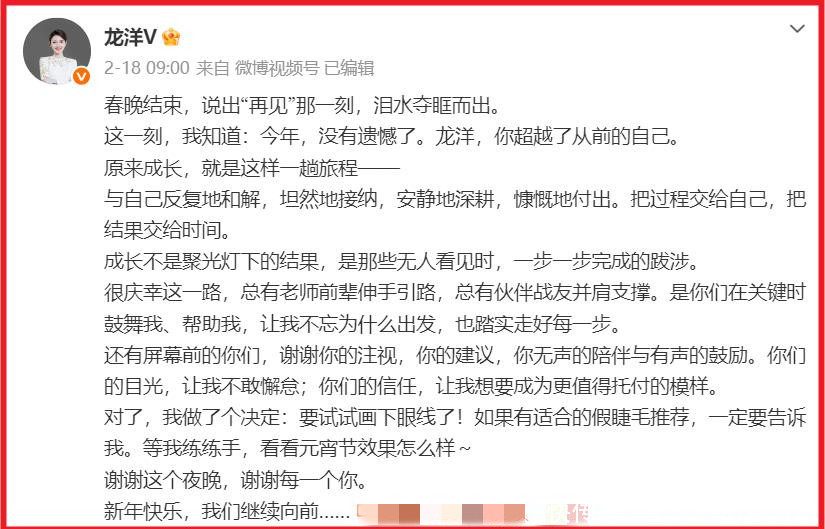 而在春晚结束后,她也动情地发布了长文,她说春晚结束,说出再见那一刻,泪水夺眶而出了。